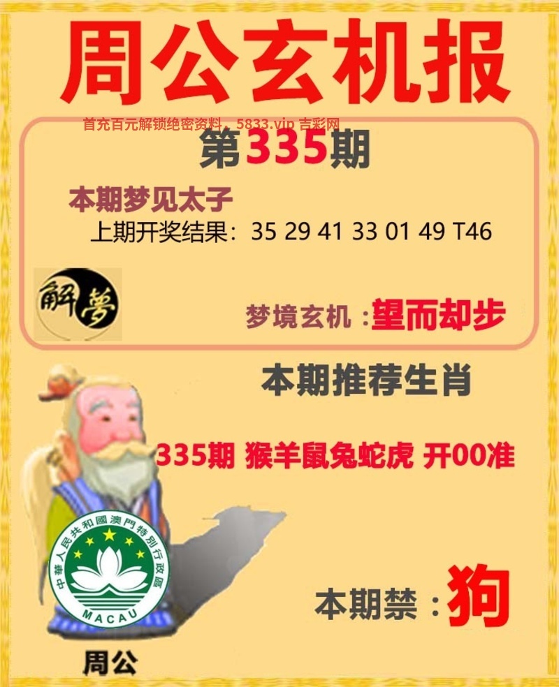 | 337期周公解梦 本期梦见:太子 梦境玄机:三顾茅庐 本期推荐:狗兔牛马蛇鸡 本期禁肖:虎 |